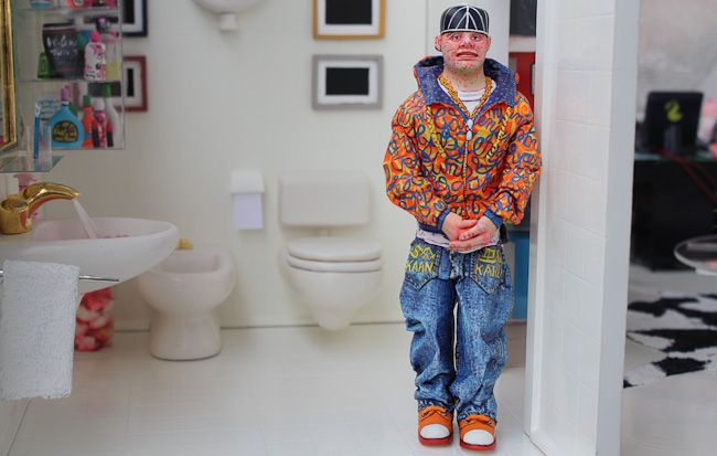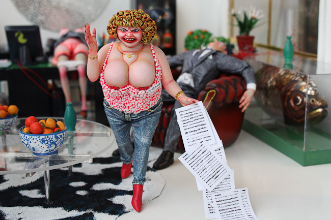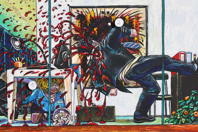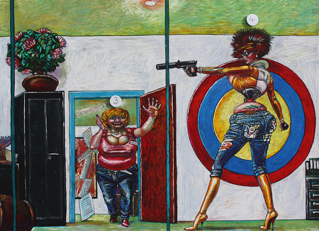 Schon in vielen anderen Arbeiten des M. H. weisen die Protagonistinnen und –en und ihr Verhalten in der Bildszeenerie eine Nähe zu entsprechenden Aktivitäten in Slapstick- und Cartoon Filmen auf. Die Logik der Zeichentrickfiguren ist ihnen vertraut. …… Als artverwand seien hier stellvertretend erwähnt: Invader Zim, Family Guy, South Park, Futurama, Stripperrella …. usw. Speziell South Park, wovon sich M. H. in diesem Berichtzeitraum 09 – 12 jeden Teil, den er erwischen kann, reinzieht, hat es ihm besonders angetan. Er hält diese Serie für die gelungenste, derzeitige Gesellschaftssatire. …… E. C.: Was soll das heißen ….. ,,Serie“ ?, ,,Cartoon“?, ,,Gesellschaftssatire“ ?. ……. , wir leben doch dort nur unser ganz normales US Leben, wie alle anderen auch. …… St. M.: Sollte es etwa sein, daß wir nur eine gigantische Trumanshow …. ? …….. Neiin, darüber will ich jetzt gar nicht nachdenken. …… K. Br.: Das untersuchen wir später. ……. Es gibt für M. H. mit eben diesen Cartoons, Kleinkunst Darbietungen gegenwärtiger Comedians und einigem avantgardistischen Theater (z. B. Shoppen und Ficken von M. Ravenhill, einiges von E. Jellinek) ähnliche Entstehungsbeweggründe. Speziell G. 1. M. scheint ja eine, auf dem Höhepunkt eingefrorene, Bühnenszeene zu sein. ……. Nicht zu vergessen ist die Lyrik und Tonsetzung der antimainstreamigen ,,Pop“ Musik. Stellvertretend seien hierbei erwähnt: Doors, Frank Zappa, Talking Heads, Clash, Sisters of Mersy, Publik Enemy, DAF, Rammstein, ….. Die Ästhetik der Computer Ballerspiele spielt bei den 2009/10er Bildern ebenfalls eine Rolle (Gangstabitch, 2009).