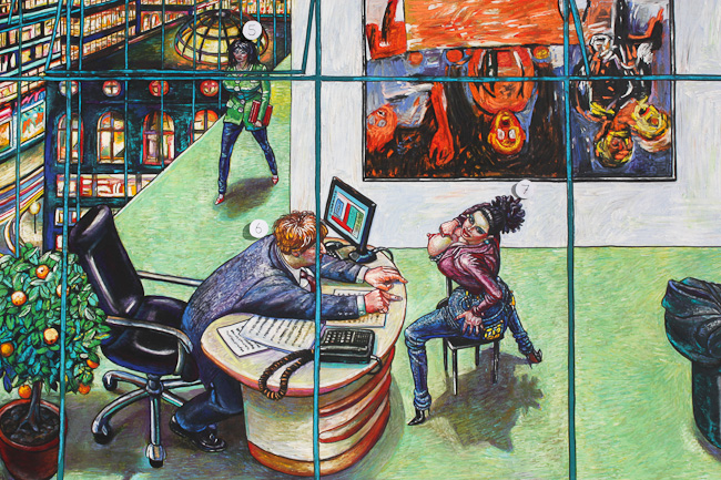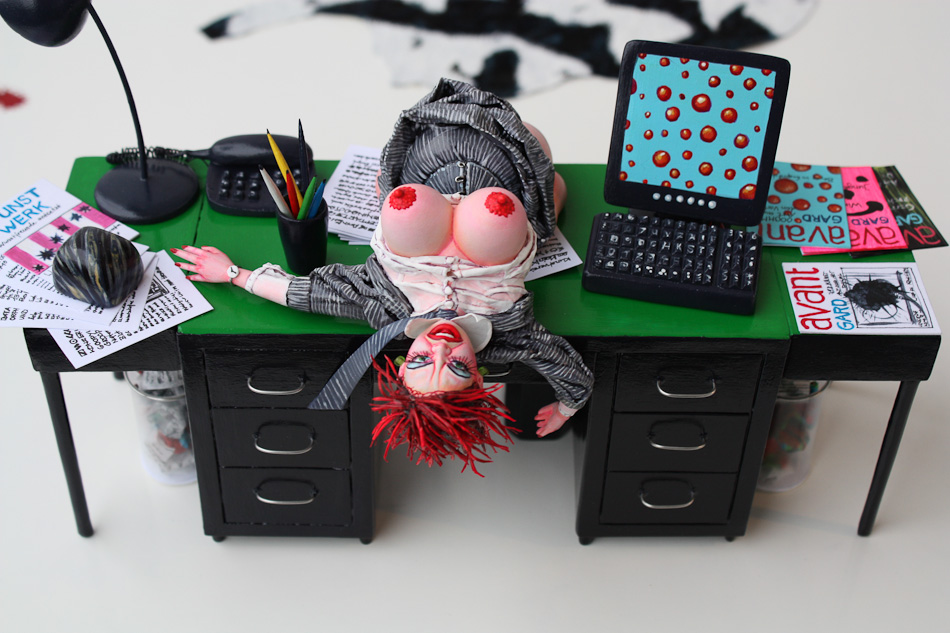 Was ist zu sehen? : Eine Puppenstube für Erwachsene? Ja, auch das. Ein schickes Büro mit angeschlossenem WC und Balkon. Eigerichtet im typischen Büro Dresscode des YUPPY Style mit standardisierten Pflanzenkübeln. Die neue gute Stube des Neobourgeois. …. Überwiegend an den Wänden hängend und hier und da im Raum stehend, bezeichnender Weise auch im WC, befindet sich Kunst der letzten 40- 50 Jahre, von 2009 aus gesehen. Kunst, die es geschafft hat, in die West Kunstmuseen, in die wichtigen Sammlungen, z. B.: Der Mick Flicks, der Marx’s usw., in den offiziellen West Kunstkanon sowie in die Kulturbeiträge der Medien zu kommen. Eine oft virtuelle Skelett Kunst, die von zahlreichen Neophyten im Geiste ihrer Paten fortgesetzt wird. Adorant- Adepten predigen die Dogmen dieser jüngsten ,,Moderne“, tradieren sie weiter und erheben sie, in ihrer Panegyrik, mit einem unglaublichen Theorie Schwulst, in einer Art sich selbst erfüllender Kunst Prophetie, zum allein selig machenden Qualitätsmaßstab. Eine der scheinheiligsten euphemistischen Lügen der letzten 20 Jahre: ,,Das Gute würde sich immer durchsetzen.“, wird hier bezeichnend konterkariert. …. Bübke und Wieckmann- Maunz möchten gern zu den Schönen und Reichen gehören. Sie möchten, ebenso wie ihre ,,erlesenen“ Sammelobjekte, als Sahne, oben auf der fetten blubbernden Kapitalismus Suppe schwimmen, möchten gern wie diese, im Wert steigen und dabei eine sanfte Symbiose mit der Suppe eingehen. Als neue Bourgeois in einer bourgeois gewollten Ordnung, sich sozusagen guttenbergisieren. ….Irgendetwas scheint da aber ganz dumm gelaufen zu sein. Der Gaszenjunge wollte dabei offensichtlich seine, ihm zugedachte Rolle in einer neuen Ordnung für ein neues Säklorum, nicht weiterhin passiv übernehmen. Anders betrachtet, treffen sich hier wohl zwei Prekariatvarianten, von ihren Gegenpolen ausgehend, irgendwo in der Mitte. …… Die arme Frau Antkoviak steht zwischen den Fronten, sie schwankt zwischen Anpassung = soziale Kompetenz + Teamfähigkeit und Revolte. ….