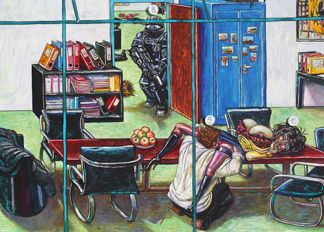 …………… M. H. bildet sich ein, zum hedonistisch neoliberalistischen ,,Leistungsträger“ von heute am besten so durchzudringen, indem er ihm, in einer scheinbar betörend reproduzierenden Darstellungsweise, sein Dorian- Grey- Bildnis vorhält und ihm auf diese Weise wenigstens einen Funken Selbstzweifel einzuimpfen versucht. Dies hält er für zielführender, als ihm bereitwillig, die sattsam bekannten Zeichen der Neomoderne zu liefern, die er sich dann, ideologisch problemlos, als unterstützende Imagegingassessoires an die Wand hinter seinem Schreibtisch hängen lassen kann. M. H. empfindet es als Vorzug der meisten seiner Arbeiten der Perioden 11 und 12, daß dies mit ihnen schwerlich möglich ist (aber ausschließen will er natürlich nichts). ………… K. Br.: M. H. erweist sich, im Rahmen unserer, von ihm erfragten, obigen Ausführungen als ein Idealist der wahrscheinlich noch daran glaubt, mit seiner Arbeit, dahingehend etwas zu bewirken, so daß es hin und wieder, beim Rezipienten doch noch ,,klick“ macht. Wir in South Park versuchen auch immer, am Ende eines Serienteils, ……… Ja, Leute, ich weiß es natürlich. , ……. E. C.: Waas? Ist das etwa mal wieder eine eurer Judenverschwörungen!? …… K. Br.: Neiiiin, natürlich nicht Cartman! …….. am Ende eines Serienteils, zu einer, für alle Beteiligten, lehrreichen Katharsis zu kommen. Aber ebenso, wie unser Freund Kenny, der meist in einem der Teile irgendwie umkommt, dann aber im nächsten Teil wieder quicklebendig auferstanden ist, scheinen auch unsere ethisch- moralischen Belehrungen aus dem Vorgängerteil, im nächsten, wieder vergessen zu sein. …….. K. Mc C: W U H M H H M M W U UH H M M N H N ……. K. Br.: ……. Ja, ja schon gut Kenny, du wirst es als Superheld MYSTERION noch selbst herausfinden und dann auch gleich wieder vergessen. ……. Wir haben deshalb gelernt diese Läuterung am Schluß eines jeweiligen Teils, als sinnfreien dramaturgischen Effekt anzusehen. Wir vermuten, daß es bei M. H. oft ähnlich ist. Eine endgültige Lüftung dieses Geheimnisses ist uns leider, auch nach erneutem Nachfragen, nicht gelungen. ………